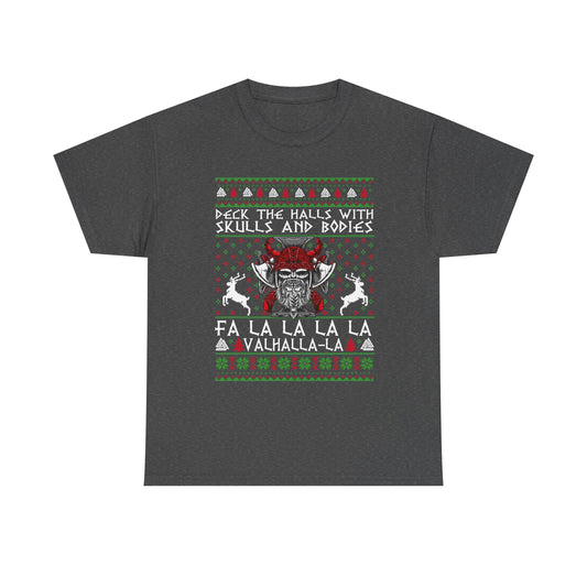 Unisex Heavy Cotton Tee - 'Deck the Halls with Skulls and Bodies' Christmas Graphic Tee