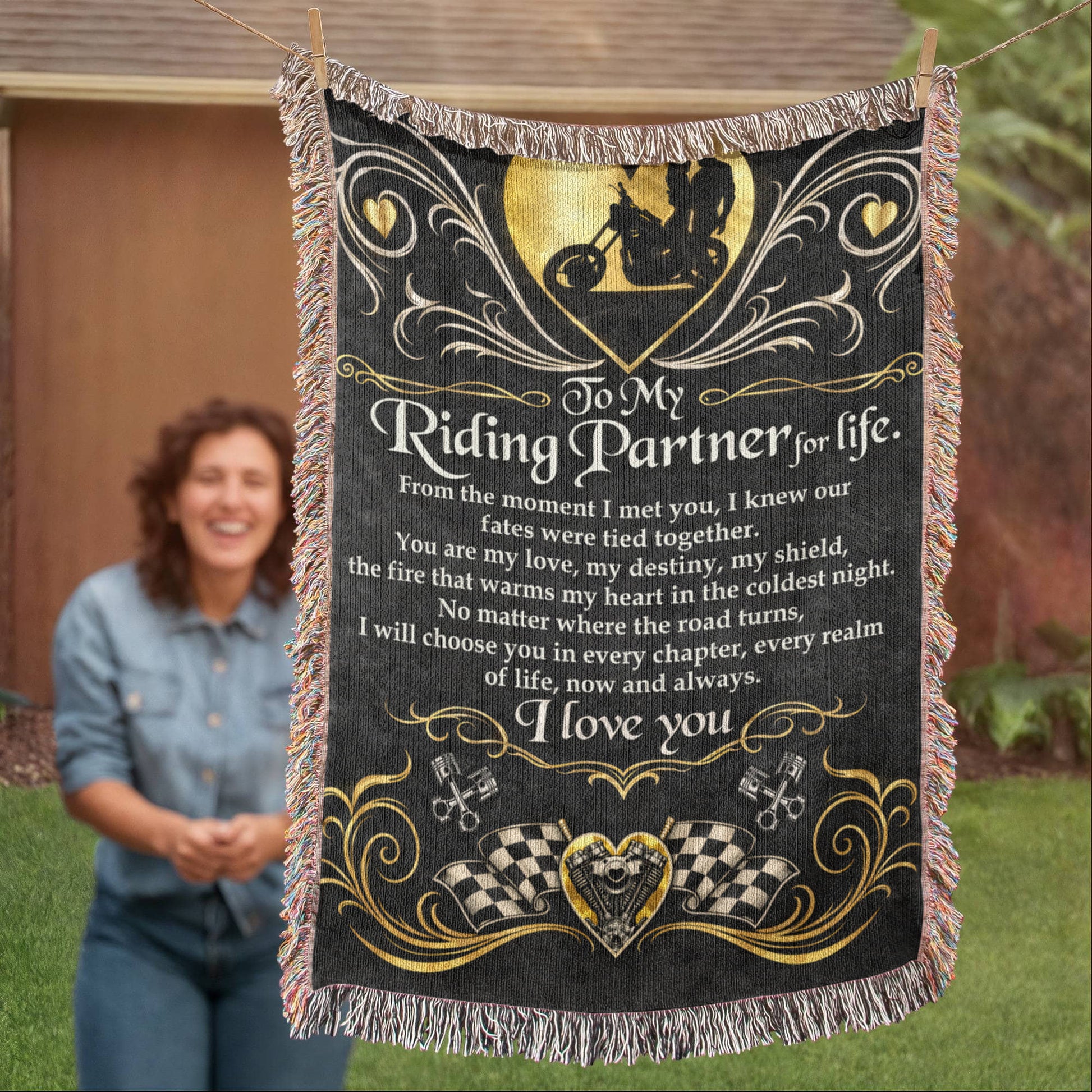 Lovingly woven on a loom using 100% cotton yarn, this blanket transforms artwork into a textured, heirloom-quality memento. Designed for riders who believe love isn’t just spoken—it’s lived, mile after mile.