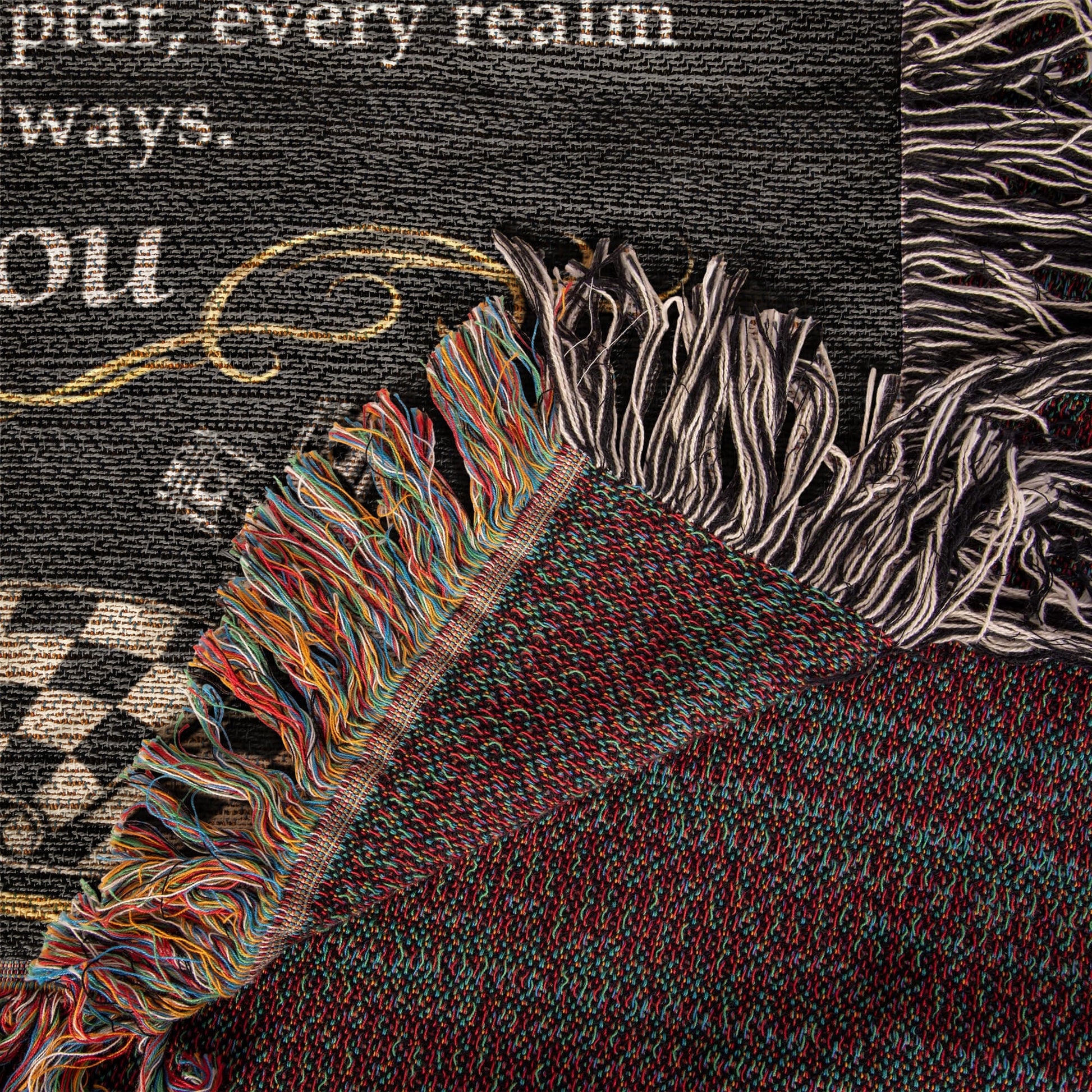 - Colorful woven fringe edges